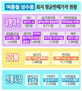 3유통업태별로 여름철 성수품 평균 판매가격을 비교한 결과, 대형마트는 생수(삼다수, 2L), 습기제거제(물먹는하마참숯, 8개묶음), 비타민음료(비타500, 100ml*10개), 과일통조림(오뚜기황도, 400g), 캔커피(칸타타원두커피프리미엄블렌드, 275ml), 감자칩(포카칩오리지날, 63g), 맥주(HITE, 355ml*6캔)이 상대적으로 저렴했다. 기업형슈퍼(SSM)는 (하림자연실록백숙, 830g), 썬크림(니베아 Fresh Sun Lotion, 125ml) 전통시장 돼지고기 삼겹살(100g), 사이다(칠성사이다, 1500ml), 이온음료(포카리스웨트, 500ml) 가격 다른 유통업태 비해 저렴했다.